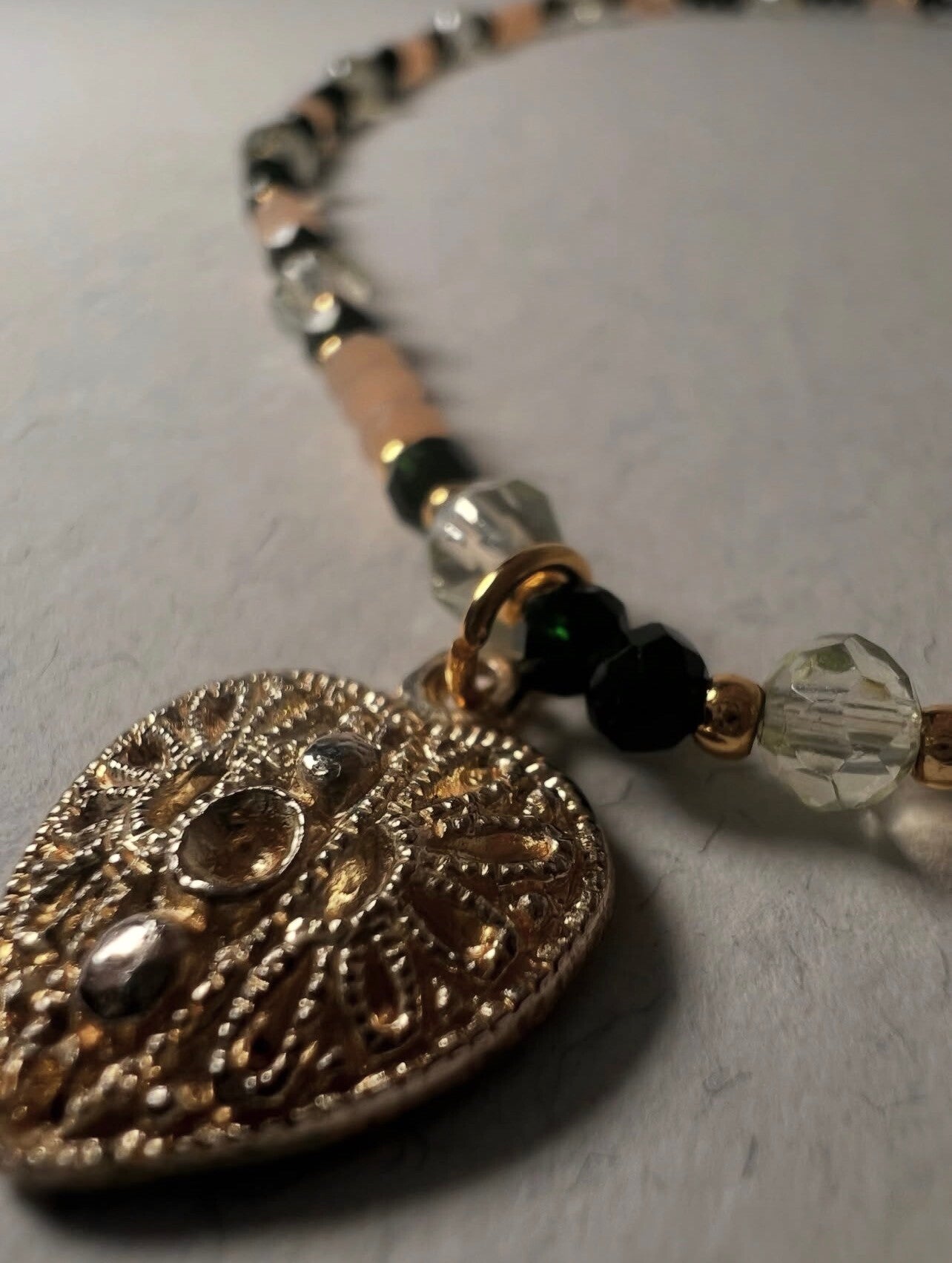 Ornate heart pendant with a rustic golden shine, strung on light & dark green beads with soft pink and gold accents. Handmade, vibrant, and perfect as a standout piece.
