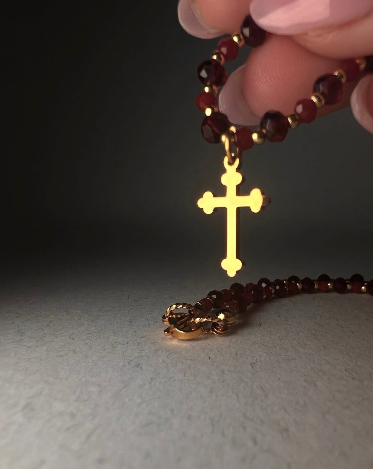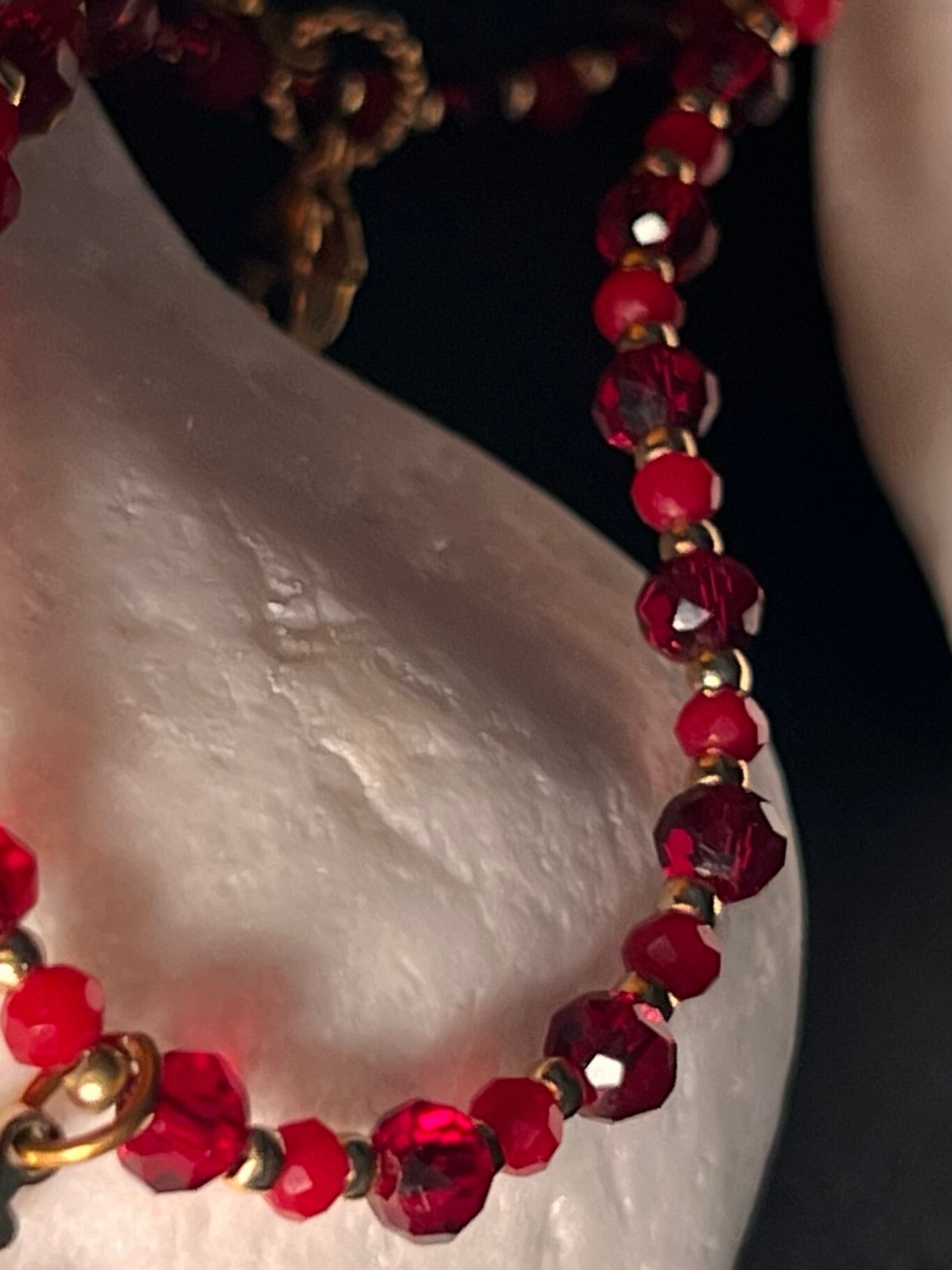 Rich red beads in dark and light shades, accented with tiny gold dots, form a striking necklace with a gold cross pendant.